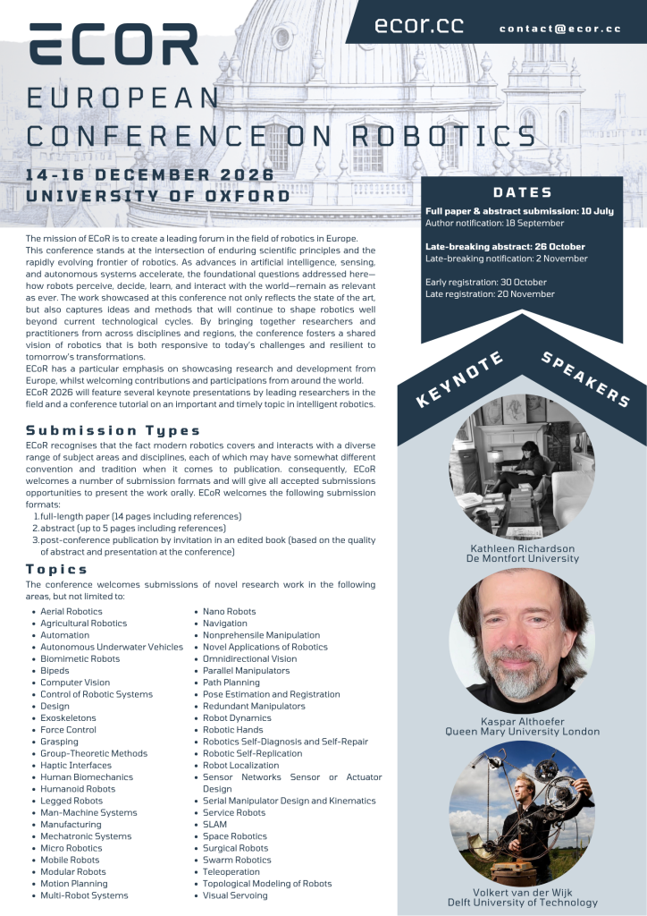 The mission of ECoR is to create a leading forum in the filed of robotics in Europe. This conference stands at the intersection of enduring scientific principles and the rapidly evolving frontier of robotics. As advances in artificial intelligence, sensing, and autonomous systems accelerate, the foundational questions addressed here—how robots perceive, decide, learn, and interact with the world—remain as relevant as ever. The work showcased at this conference not only reflects the state of the art, but also captures ideas and methods that will continue to shape robotics well beyond current technological cycles. By bringing together researchers and practitioners from across disciplines and regions, the conference fosters a shared vision of robotics that is both responsive to today’s challenges and resilient to tomorrow’s transformations. ECoR has a particular emphasis on showcasing research and development from Europe, whilst welcoming contributions and participations from around the world.
